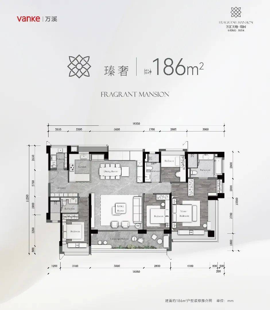 建面约 186m² 4 房 + 2 厅 3 卫 + 灵动空间,正南向 01、02 户型一线花地湾河涌景观视野,全明四开间朝南,约 18.3 米极致奢幕视野,LDKB 洄游路线,多功能巨幕宽厅,多功能岛台,端厅套房主卧