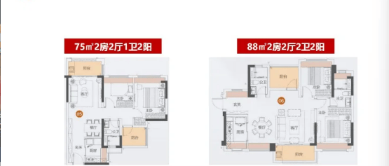 88㎡三房二卫新规户型:总价71-75万,作为新规产品,使用率高达120%,空间性价比突出。户型采用LDKB一体化设计,客厅、餐厅、厨房、阳台相连,形成开阔的公共活动空间,方便家人互动交流;两个卫生间设计,满足多人口家庭的使用需求,避免早晚使用高峰拥堵;主卧配备独立卫生间和衣帽间,提升居住私密性和舒适度。