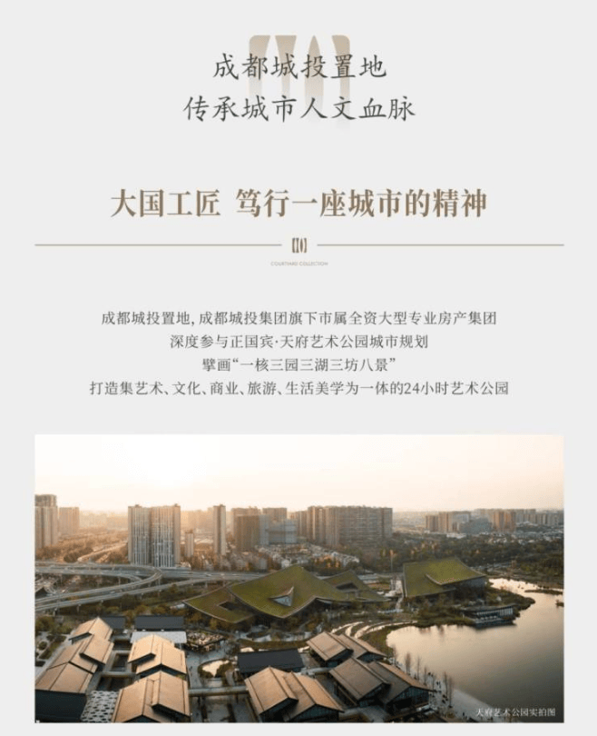 雄踞成都金牛区国宾板块核心,与天府艺术公园为邻,国宾7号院作为成都城投置地“院”系开篇的1号作品,以“院为大国藏春秋”的抱负,于约58亩土地上,匠造容积率仅1.4的纯粹低密院落住区。项目规划仅20栋5-8层新式川西风格洋房,打造168席独门独院、户户配备私家花园的传世宅邸。以城市罕见的土地禀赋、极致私密的圈层氛围与无所不在的艺术生态,为时代人物敬献一处可收藏、可传承的城市精神家园。