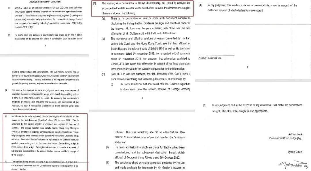 这一判决结果与境外法院截然相反。争议的焦点在于,所谓的代持协议,第一页与第二页不是一次形成的。境外法院认定胡兰和高家仁存在伪造行为,而境内法院虽然认可代持协议的签署过程存在模糊性,但仍判定协议有效。