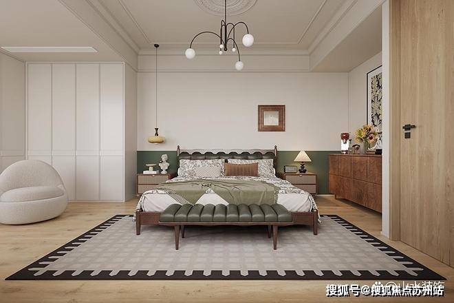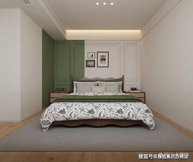 绿宝园·翡梵售楼处电话:【预约看房热线】绿宝园·翡梵官方售楼处电线【售楼处电话/地址】绿宝园·翡梵售楼处电话:【开发商认证】按照居住者的要求,对三楼布局重新优化,将过道扩充进主卧室,改多功能套房。主卧室的睡眠区域我们在暖白基调中,加入绿色拼接,丰富视觉层次,也多了些法式复古的韵味。带角花设计的石膏线做双框设计,简约利落,使得墙面有了多维立体的视觉效果。